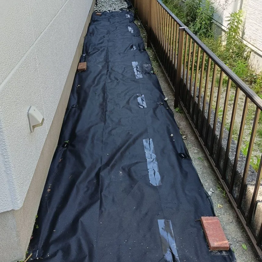 防草シートの補修: 以前施工した箇所の剥がれや隙間を丁寧にメンテナンス。